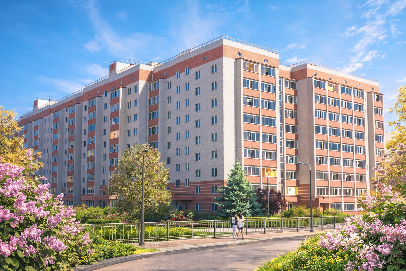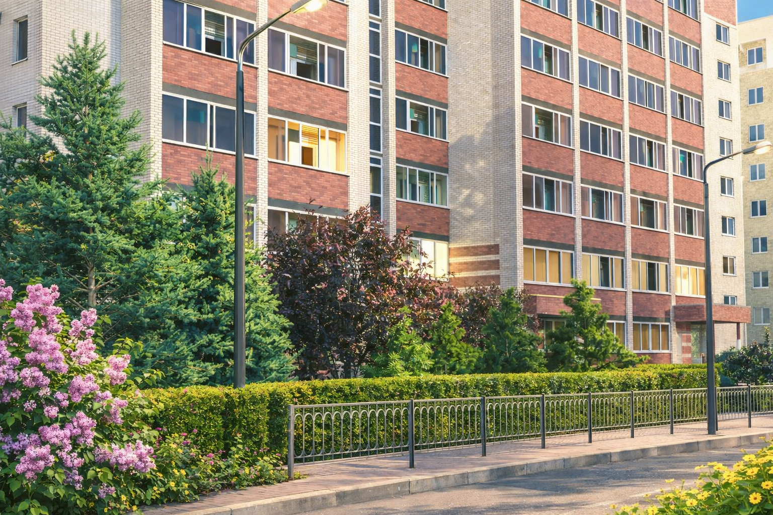 ЖК "Сиреневый квартал" построен полностью из кирпича. Главное достоинство этого материала — прочность и долговечность. Стены в два кирпича сохраняют тепло и обладают высокой шумоизоляцией. Срок эксплуатации кирпичного здания может превышать целый век.
